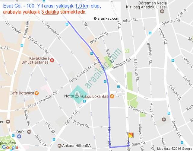 Esat Cd. - 100. Yıl arası yaklaşık olarak 90 km/h ile yukarıda belirtilen sürede olup, iki yerin kuş uçuşu uzaklığı (mesafesi) 1'dir. Yolculuk otobüsle 3 dakika sürmektedir.