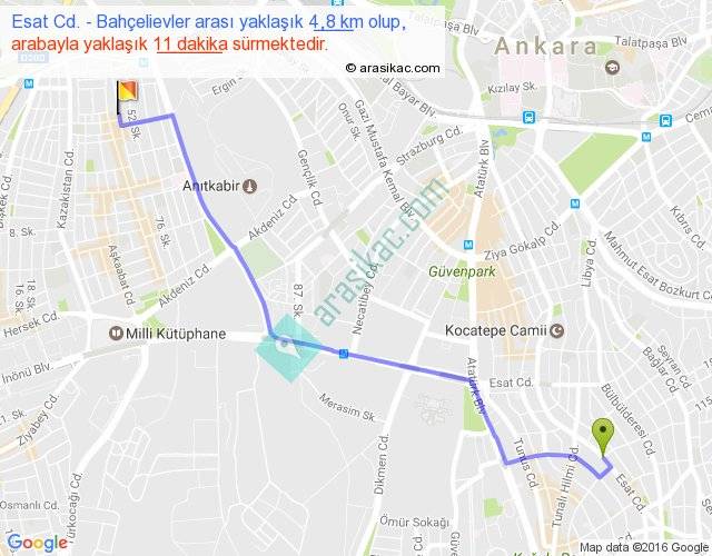 Esat Cd. - Bahçelievler arası yaklaşık olarak 90 km/h ile yukarıda belirtilen sürede olup, iki yerin kuş uçuşu uzaklığı (mesafesi) 4'dir. Yolculuk otobüsle 14 dakika sürmektedir.