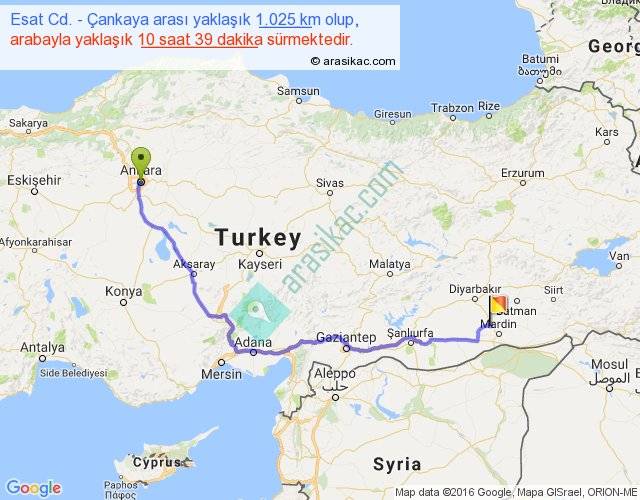 Esat Cd. - Çankaya arası yaklaşık olarak 90 km/h ile yukarıda belirtilen sürede olup, iki yerin kuş uçuşu uzaklığı (mesafesi) 717'dir. Eğer belirtilen yerler arasında uçak seferi var ise bu süre uçakla 1 saat 06 dakika'ya kadar düşebilir. Yolculuk otobüsle 13 saat 50 dakika sürmektedir.