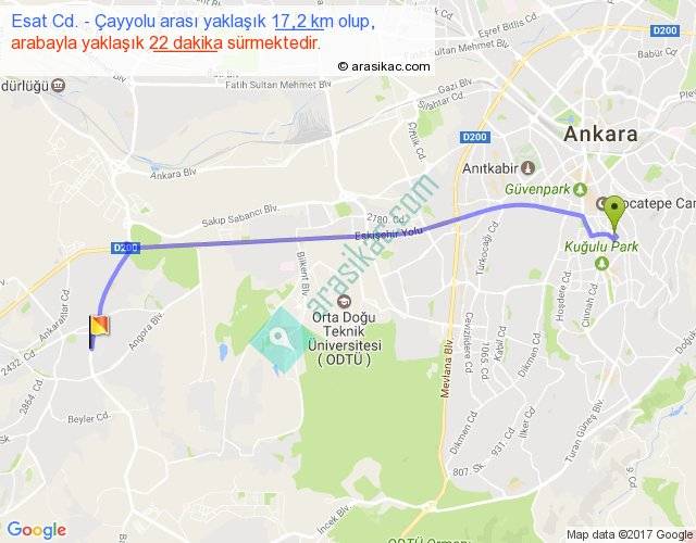 Esat Cd. - Çayyolu arası yaklaşık olarak 90 km/h ile yukarıda belirtilen sürede olup, iki yerin kuş uçuşu uzaklığı (mesafesi) 14'dir. Yolculuk otobüsle 28 dakika sürmektedir.