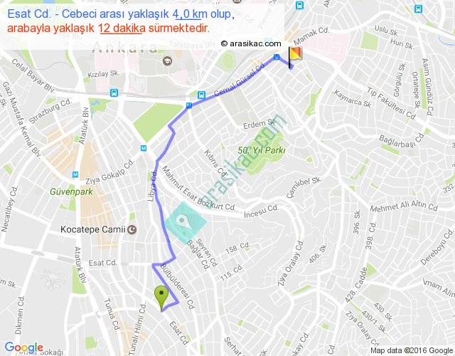 Eğer Esat Cd. Cebeci arası ne kadar yakar (benzin/mazot) diyorsanız, kilometrede 3 ₺ yakan bir aracınız var ise 12, km'de 4 ₺ yakan bir aracınız var ise 16, km'de 5 ₺ yakan bir aracınız var ise 20 ile bu yolculuğu tamamlayabilirsiniz.