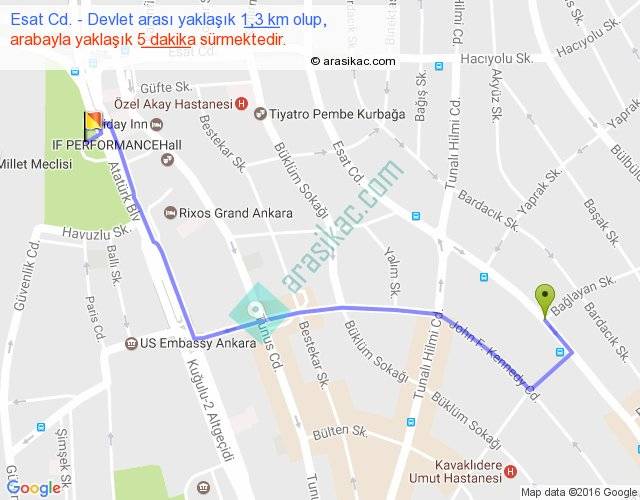 Esat Cd. - Devlet arası yaklaşık olarak 90 km/h ile yukarıda belirtilen sürede olup, iki yerin kuş uçuşu uzaklığı (mesafesi) 1'dir. Yolculuk otobüsle 6 dakika sürmektedir.