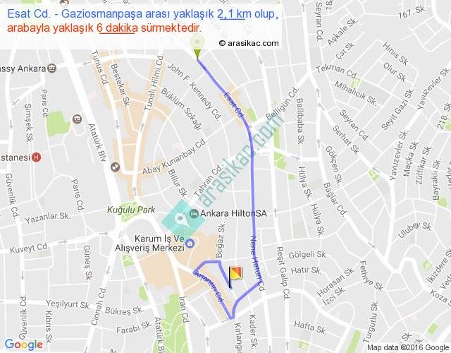 Eğer Esat Cd. Gaziosmanpaşa arası ne kadar yakar (benzin/mazot) diyorsanız, kilometrede 3 ₺ yakan bir aracınız var ise 6, km'de 4 ₺ yakan bir aracınız var ise 8, km'de 5 ₺ yakan bir aracınız var ise 10 ile bu yolculuğu tamamlayabilirsiniz.