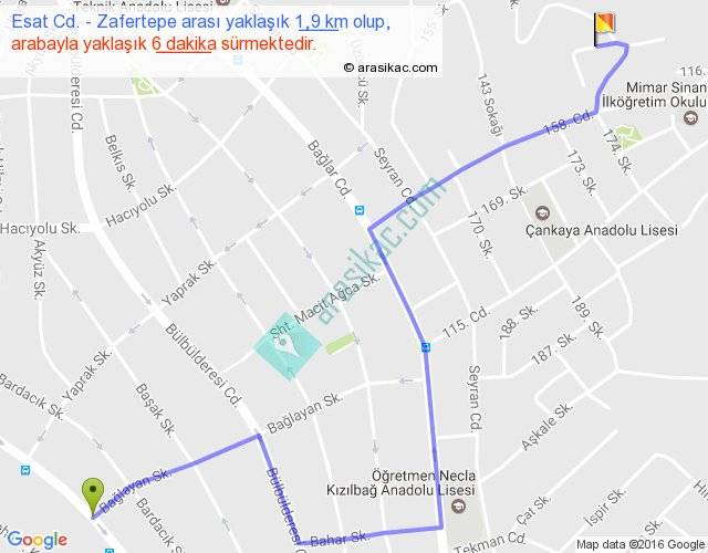 Esat Cd. - Zafertepe arası yaklaşık olarak 90 km/h ile yukarıda belirtilen sürede olup, iki yerin kuş uçuşu uzaklığı (mesafesi) 1'dir. Yolculuk otobüsle 7 dakika sürmektedir.