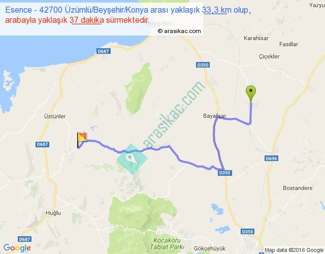 Esence - 42700 Üzümlü Beyşehir Konya arası yaklaşık olarak 90 km/h ile yukarıda belirtilen sürede olup, iki yerin kuş uçuşu uzaklığı (mesafesi) 21'dir. Yolculuk otobüsle 48 dakika sürmektedir.