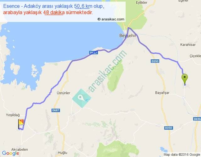 Esence - Adaköy arası yaklaşık olarak 90 km/h ile yukarıda belirtilen sürede olup, iki yerin kuş uçuşu uzaklığı (mesafesi) 33'dir. Yolculuk otobüsle 1 saat 2 dakika sürmektedir.