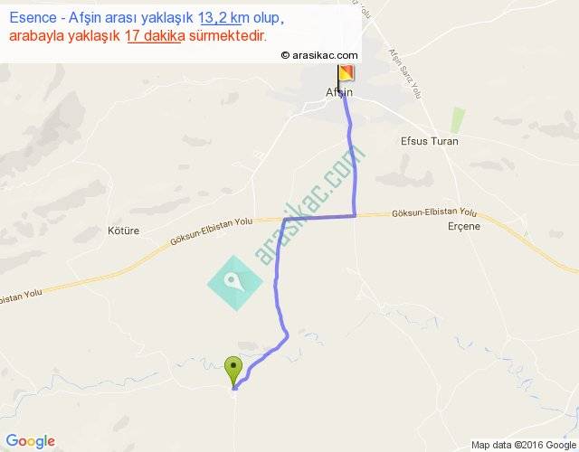Esence - Afşin arası yaklaşık olarak 90 km/h ile yukarıda belirtilen sürede olup, iki yerin kuş uçuşu uzaklığı (mesafesi) 10'dir. Yolculuk otobüsle 22 dakika sürmektedir.