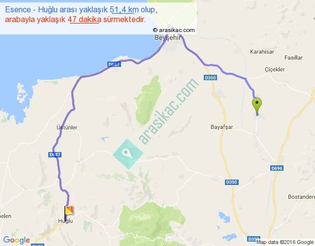 Esence - Huğlu arası yaklaşık olarak 90 km/h ile yukarıda belirtilen sürede olup, iki yerin kuş uçuşu uzaklığı (mesafesi) 27'dir. Yolculuk otobüsle 1 saat 1 dakika sürmektedir.