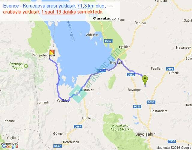 Esence - Kurucaova arası yaklaşık olarak 90 km/h ile yukarıda belirtilen sürede olup, iki yerin kuş uçuşu uzaklığı (mesafesi) 40'dir. Yolculuk otobüsle 1 saat 42 dakika sürmektedir.