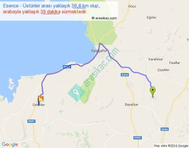 Esence - Üstünler arası yaklaşık olarak 90 km/h ile yukarıda belirtilen sürede olup, iki yerin kuş uçuşu uzaklığı (mesafesi) 23'dir. Yolculuk otobüsle 50 dakika sürmektedir.