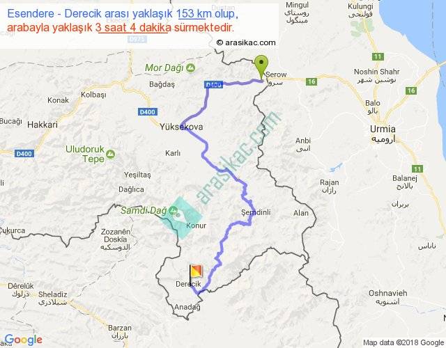 Esendere - Derecik arası yaklaşık olarak 90 km/h ile yukarıda belirtilen sürede olup, iki yerin kuş uçuşu uzaklığı (mesafesi) 75'dir. Yolculuk otobüsle 3 saat 59 dakika sürmektedir.