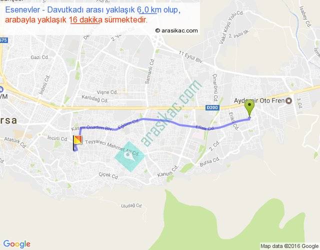 Esenevler - Davutkadı arası yaklaşık olarak 90 km/h ile yukarıda belirtilen sürede olup, iki yerin kuş uçuşu uzaklığı (mesafesi) 5'dir. Yolculuk otobüsle 20 dakika sürmektedir.