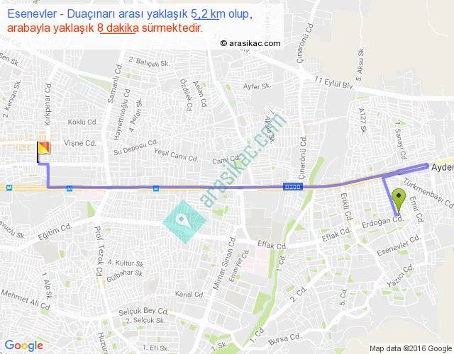Esenevler - Duaçınarı arası yaklaşık olarak 90 km/h ile yukarıda belirtilen sürede olup, iki yerin kuş uçuşu uzaklığı (mesafesi) 4'dir. Yolculuk otobüsle 10 dakika sürmektedir.