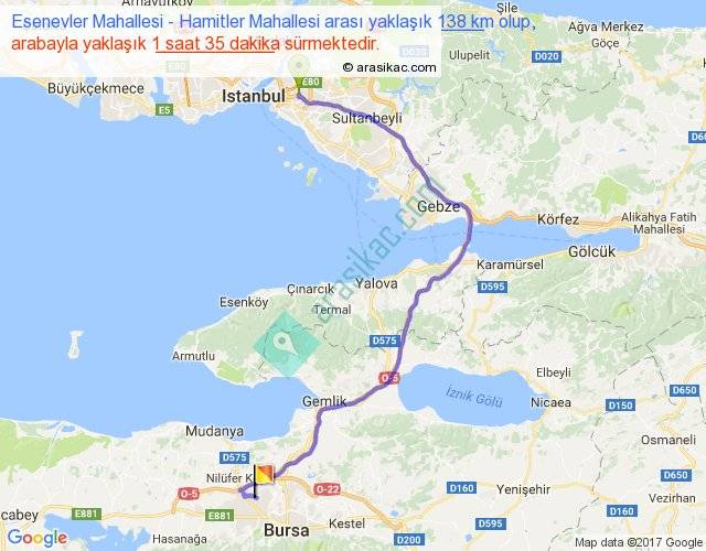 Esenevler Mahallesi - Hamitler Mahallesi arası yaklaşık olarak 90 km/h ile yukarıda belirtilen sürede olup, iki yerin kuş uçuşu uzaklığı (mesafesi) 85'dir. Yolculuk otobüsle 2 saat 3 dakika sürmektedir.