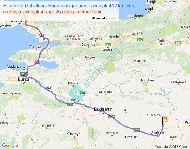 Esenevler Mahallesi - Hüdavendiğar arası yaklaşık olarak 90 km/h ile yukarıda belirtilen sürede olup, iki yerin kuş uçuşu uzaklığı (mesafesi) 267'dir. Eğer belirtilen yerler arasında uçak seferi var ise bu süre uçakla 24 dakika'ya kadar düşebilir. Yolculuk otobüsle 5 saat 44 dakika sürmektedir.