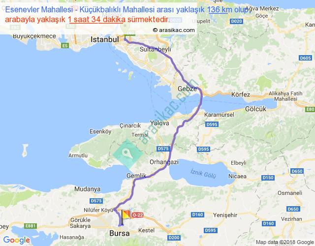 Esenevler Mahallesi - Küçükbalıklı Mahallesi arası yaklaşık olarak 90 km/h ile yukarıda belirtilen sürede olup, iki yerin kuş uçuşu uzaklığı (mesafesi) 87'dir. Yolculuk otobüsle 2 saat 2 dakika sürmektedir.