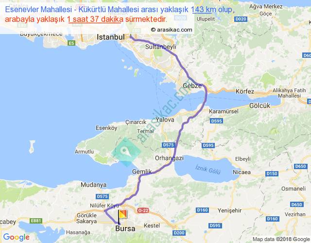 Esenevler Mahallesi - Kükürtlü Mahallesi arası yaklaşık olarak 90 km/h ile yukarıda belirtilen sürede olup, iki yerin kuş uçuşu uzaklığı (mesafesi) 89'dir. Yolculuk otobüsle 2 saat 6 dakika sürmektedir.