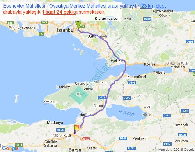 Esenevler Mahallesi - Ovaakça Merkez Mahallesi arası yaklaşık olarak 90 km/h ile yukarıda belirtilen sürede olup, iki yerin kuş uçuşu uzaklığı (mesafesi) 79'dir. Yolculuk otobüsle 1 saat 49 dakika sürmektedir.