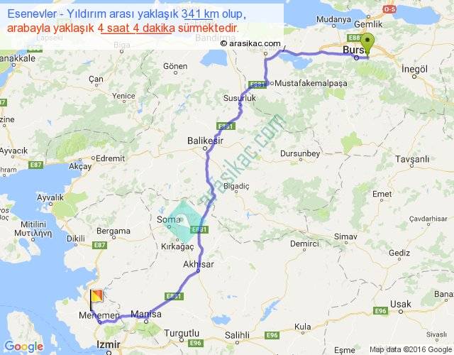 Esenevler - Yıldırım arası yaklaşık olarak 90 km/h ile yukarıda belirtilen sürede olup, iki yerin kuş uçuşu uzaklığı (mesafesi) 247'dir. Yolculuk otobüsle 5 saat 17 dakika sürmektedir.
