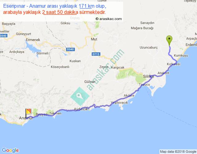 Esenpınar - Anamur arası yaklaşık olarak 90 km/h ile yukarıda belirtilen sürede olup, iki yerin kuş uçuşu uzaklığı (mesafesi) 127'dir. Yolculuk otobüsle 3 saat 41 dakika sürmektedir.