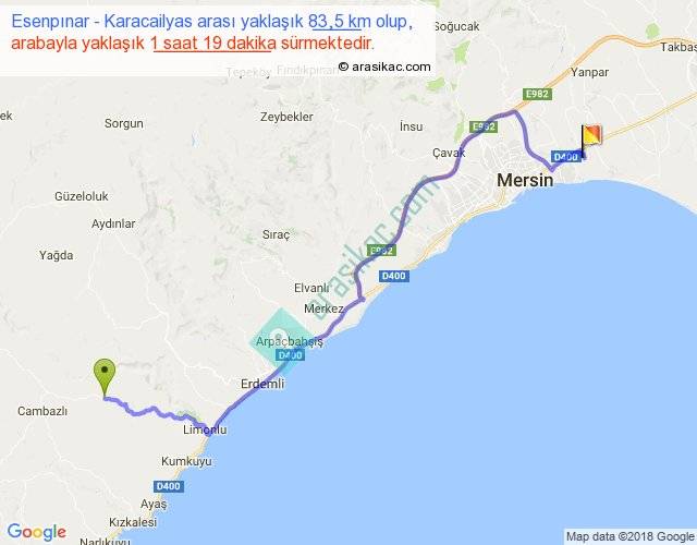 Esenpınar - Karacailyas arası yaklaşık olarak 90 km/h ile yukarıda belirtilen sürede olup, iki yerin kuş uçuşu uzaklığı (mesafesi) 60'dir. Yolculuk otobüsle 1 saat 42 dakika sürmektedir.