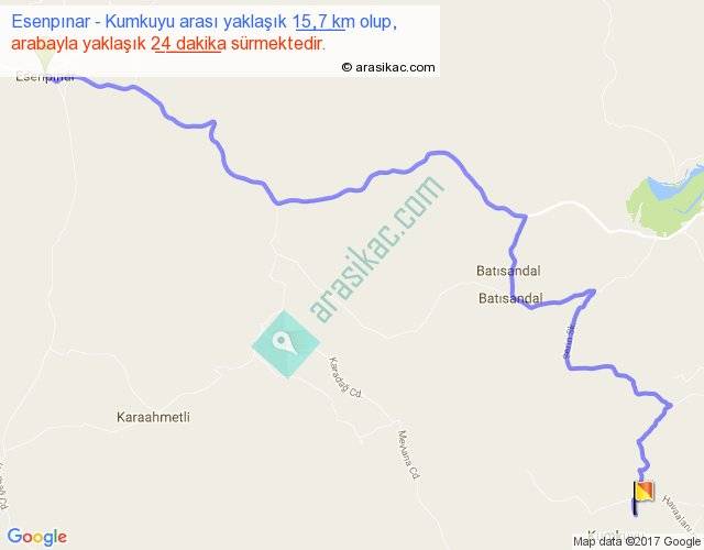 Esenpınar - Kumkuyu arası yaklaşık olarak 90 km/h ile yukarıda belirtilen sürede olup, iki yerin kuş uçuşu uzaklığı (mesafesi) 10'dir. Yolculuk otobüsle 31 dakika sürmektedir.