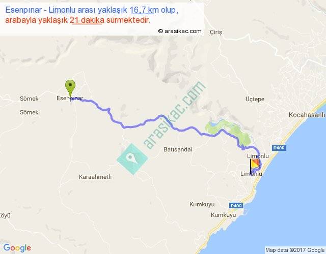 Esenpınar - Limonlu arası yaklaşık olarak 90 km/h ile yukarıda belirtilen sürede olup, iki yerin kuş uçuşu uzaklığı (mesafesi) 12'dir. Yolculuk otobüsle 27 dakika sürmektedir.