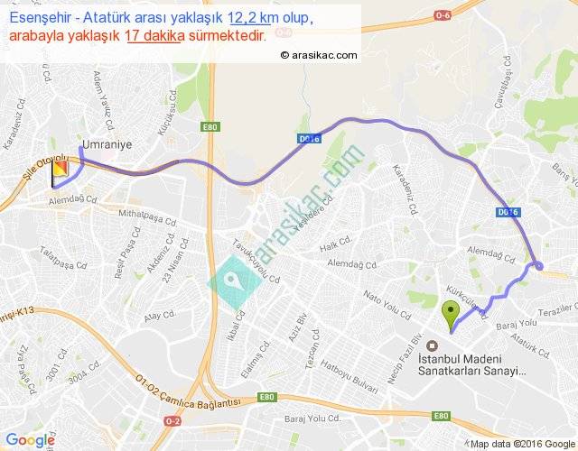Esenşehir - Atatürk arası yaklaşık olarak 90 km/h ile yukarıda belirtilen sürede olup, iki yerin kuş uçuşu uzaklığı (mesafesi) 7'dir. Yolculuk otobüsle 22 dakika sürmektedir.