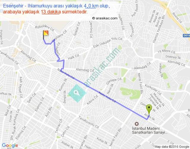 Esenşehir - Ihlamurkuyu arası yaklaşık olarak 90 km/h ile yukarıda belirtilen sürede olup, iki yerin kuş uçuşu uzaklığı (mesafesi) 3'dir. Yolculuk otobüsle 16 dakika sürmektedir.