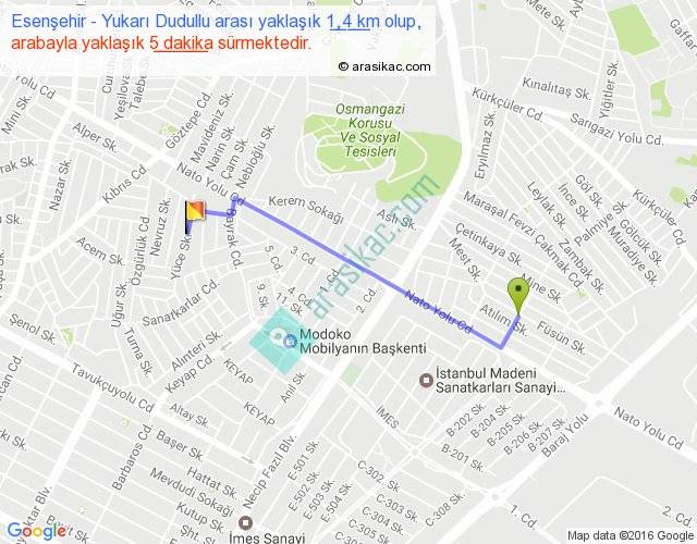 Esenşehir - Yukarı Dudullu arası yaklaşık olarak 90 km/h ile yukarıda belirtilen sürede olup, iki yerin kuş uçuşu uzaklığı (mesafesi) 1'dir. Yolculuk otobüsle 6 dakika sürmektedir.