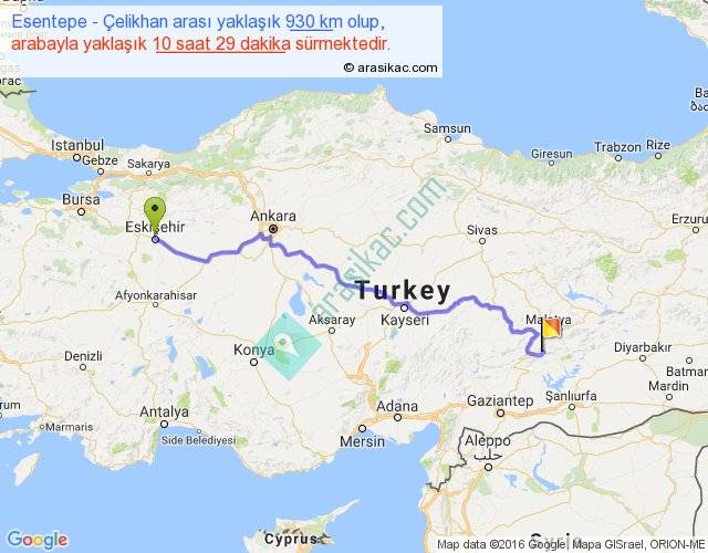 Esentepe - Çelikhan arası yaklaşık olarak 90 km/h ile yukarıda belirtilen sürede olup, iki yerin kuş uçuşu uzaklığı (mesafesi) 692'dir. Eğer belirtilen yerler arasında uçak seferi var ise bu süre uçakla 1 saat 03 dakika'ya kadar düşebilir. Yolculuk otobüsle 13 saat 37 dakika sürmektedir.