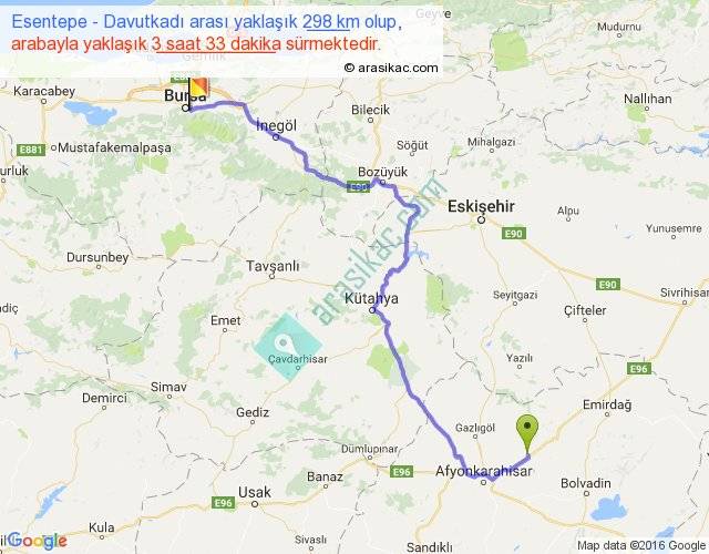 Esentepe - Davutkadı arası yaklaşık olarak 90 km/h ile yukarıda belirtilen sürede olup, iki yerin kuş uçuşu uzaklığı (mesafesi) 204'dir. Yolculuk otobüsle 4 saat 36 dakika sürmektedir.