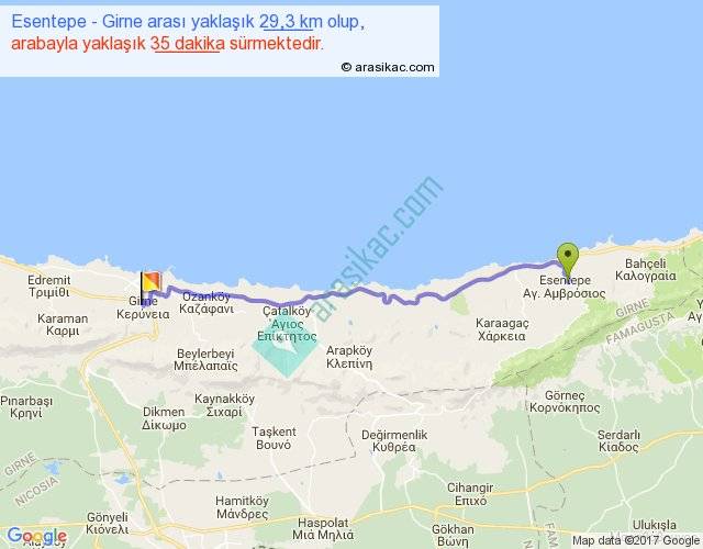 Esentepe - Girne arası yaklaşık olarak 90 km/h ile yukarıda belirtilen sürede olup, iki yerin kuş uçuşu uzaklığı (mesafesi) 24'dir. Yolculuk otobüsle 45 dakika sürmektedir.