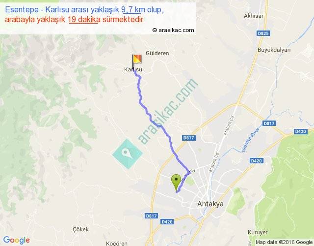Esentepe - Karlısu arası yaklaşık olarak 90 km/h ile yukarıda belirtilen sürede olup, iki yerin kuş uçuşu uzaklığı (mesafesi) 8'dir. Yolculuk otobüsle 24 dakika sürmektedir.