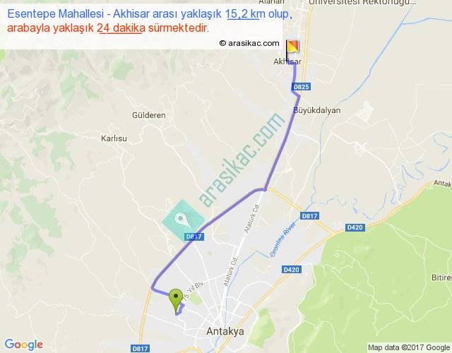 Esentepe Mahallesi - Akhisar arası yaklaşık olarak 90 km/h ile yukarıda belirtilen sürede olup, iki yerin kuş uçuşu uzaklığı (mesafesi) 12'dir. Yolculuk otobüsle 31 dakika sürmektedir.