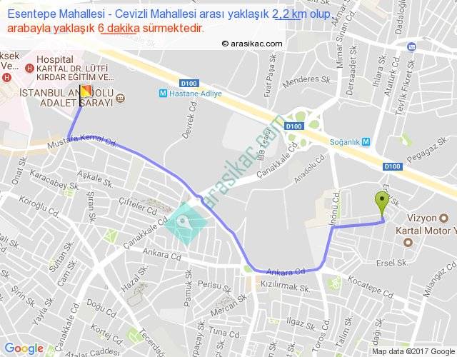 Esentepe Mahallesi - Cevizli Mahallesi arası yaklaşık olarak 90 km/h ile yukarıda belirtilen sürede olup, iki yerin kuş uçuşu uzaklığı (mesafesi) 2'dir. Yolculuk otobüsle 7 dakika sürmektedir.