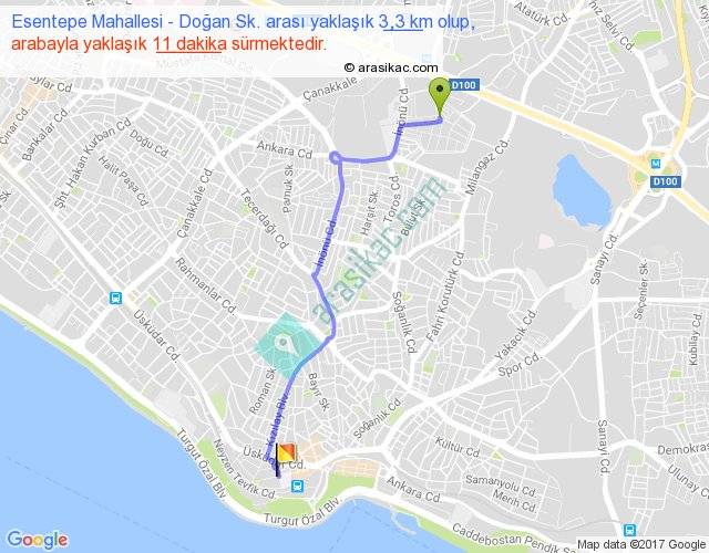 Esentepe Mahallesi - Doğan Sk. arası yaklaşık olarak 90 km/h ile yukarıda belirtilen sürede olup, iki yerin kuş uçuşu uzaklığı (mesafesi) 3'dir. Yolculuk otobüsle 14 dakika sürmektedir.