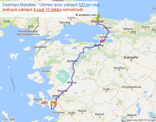 Esentepe Mahallesi - Ürkmez arası yaklaşık olarak 90 km/h ile yukarıda belirtilen sürede olup, iki yerin kuş uçuşu uzaklığı (mesafesi) 376'dir. Eğer belirtilen yerler arasında uçak seferi var ise bu süre uçakla 34 dakika'ya kadar düşebilir. Yolculuk otobüsle 8 saat 1 dakika sürmektedir.