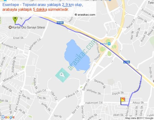 Esentepe - Topselvi arası yaklaşık olarak 90 km/h ile yukarıda belirtilen sürede olup, iki yerin kuş uçuşu uzaklığı (mesafesi) 2'dir. Yolculuk otobüsle 6 dakika sürmektedir.