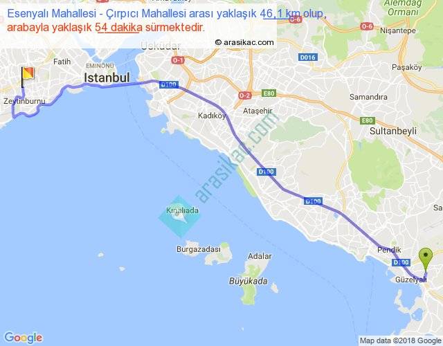 Esenyalı Mahallesi - Çırpıcı Mahallesi arası yaklaşık olarak 90 km/h ile yukarıda belirtilen sürede olup, iki yerin kuş uçuşu uzaklığı (mesafesi) 37'dir. Yolculuk otobüsle 1 saat 10 dakika sürmektedir.