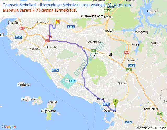 Esenyalı Mahallesi - Ihlamurkuyu Mahallesi arası yaklaşık olarak 90 km/h ile yukarıda belirtilen sürede olup, iki yerin kuş uçuşu uzaklığı (mesafesi) 22'dir. Yolculuk otobüsle 42 dakika sürmektedir.
