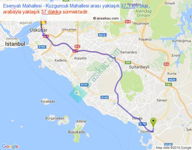 Esenyalı Mahallesi - Kuzguncuk Mahallesi arası yaklaşık olarak 90 km/h ile yukarıda belirtilen sürede olup, iki yerin kuş uçuşu uzaklığı (mesafesi) 29'dir. Yolculuk otobüsle 48 dakika sürmektedir.