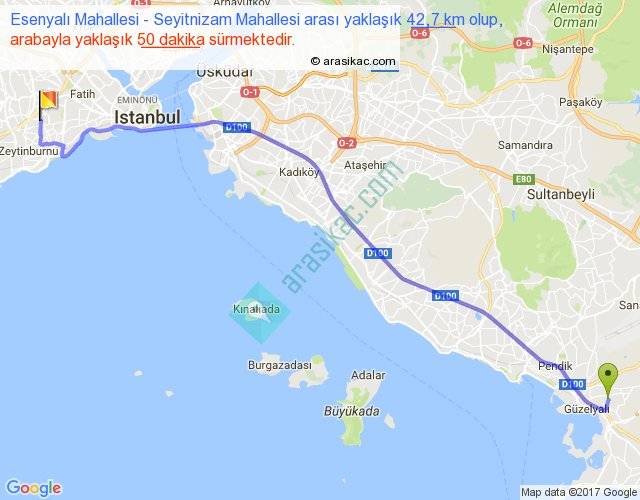 Esenyalı Mahallesi - Seyitnizam Mahallesi arası yaklaşık olarak 90 km/h ile yukarıda belirtilen sürede olup, iki yerin kuş uçuşu uzaklığı (mesafesi) 36'dir. Yolculuk otobüsle 1 saat 5 dakika sürmektedir.