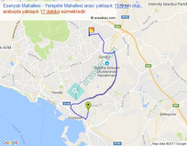 Esenyalı Mahallesi - Yenişehir Mahallesi arası yaklaşık olarak 90 km/h ile yukarıda belirtilen sürede olup, iki yerin kuş uçuşu uzaklığı (mesafesi) 7'dir. Yolculuk otobüsle 22 dakika sürmektedir.