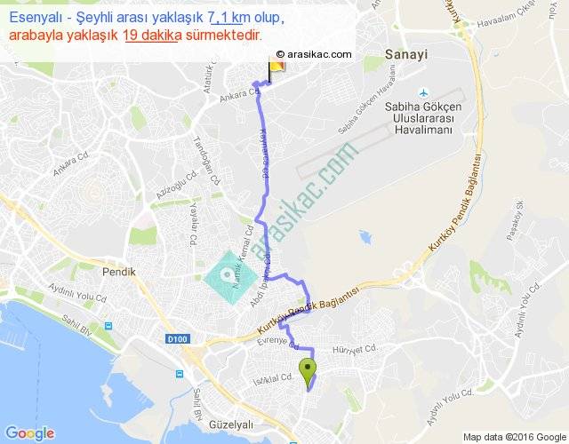 Esenyalı - Şeyhli arası yaklaşık olarak 90 km/h ile yukarıda belirtilen sürede olup, iki yerin kuş uçuşu uzaklığı (mesafesi) 5'dir. Yolculuk otobüsle 24 dakika sürmektedir.