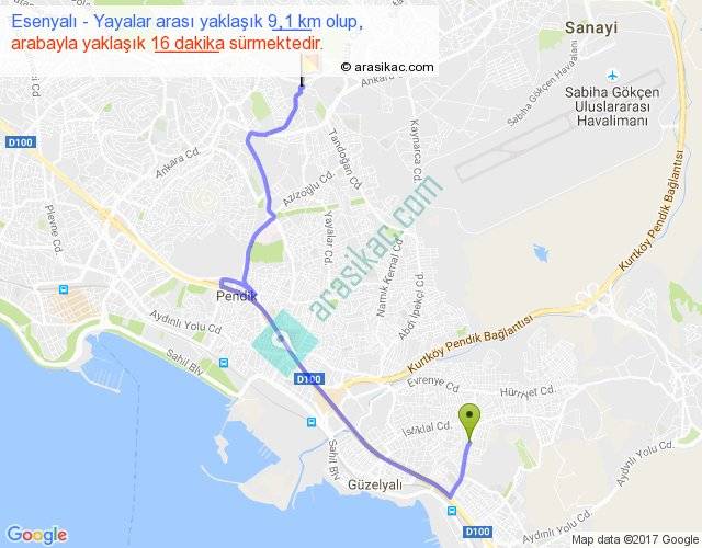 Esenyalı - Yayalar arası yaklaşık olarak 90 km/h ile yukarıda belirtilen sürede olup, iki yerin kuş uçuşu uzaklığı (mesafesi) 5'dir. Yolculuk otobüsle 20 dakika sürmektedir.
