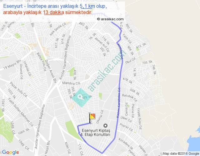 Esenyurt - İncirtepe arası yaklaşık olarak 90 km/h ile yukarıda belirtilen sürede olup, iki yerin kuş uçuşu uzaklığı (mesafesi) 2'dir. Yolculuk otobüsle 16 dakika sürmektedir.