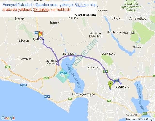 Esenyurt İstanbul - Çatalca arası yaklaşık olarak 90 km/h ile yukarıda belirtilen sürede olup, iki yerin kuş uçuşu uzaklığı (mesafesi) 21'dir. Yolculuk otobüsle 49 dakika sürmektedir.