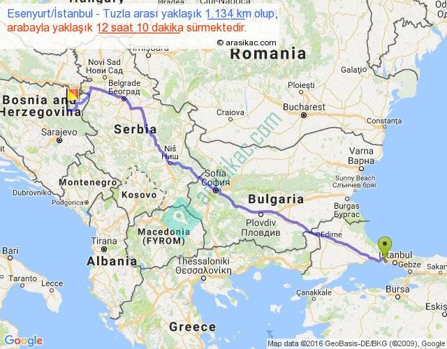 Esenyurt İstanbul - Tuzla arası yaklaşık olarak 90 km/h ile yukarıda belirtilen sürede olup, iki yerin kuş uçuşu uzaklığı (mesafesi) 897'dir. Eğer belirtilen yerler arasında uçak seferi var ise bu süre uçakla 1 saat 22 dakika'ya kadar düşebilir. Yolculuk otobüsle 15 saat 49 dakika sürmektedir.