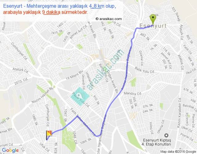 Esenyurt - Mehterçeşme arası yaklaşık olarak 90 km/h ile yukarıda belirtilen sürede olup, iki yerin kuş uçuşu uzaklığı (mesafesi) 4'dir. Yolculuk otobüsle 11 dakika sürmektedir.